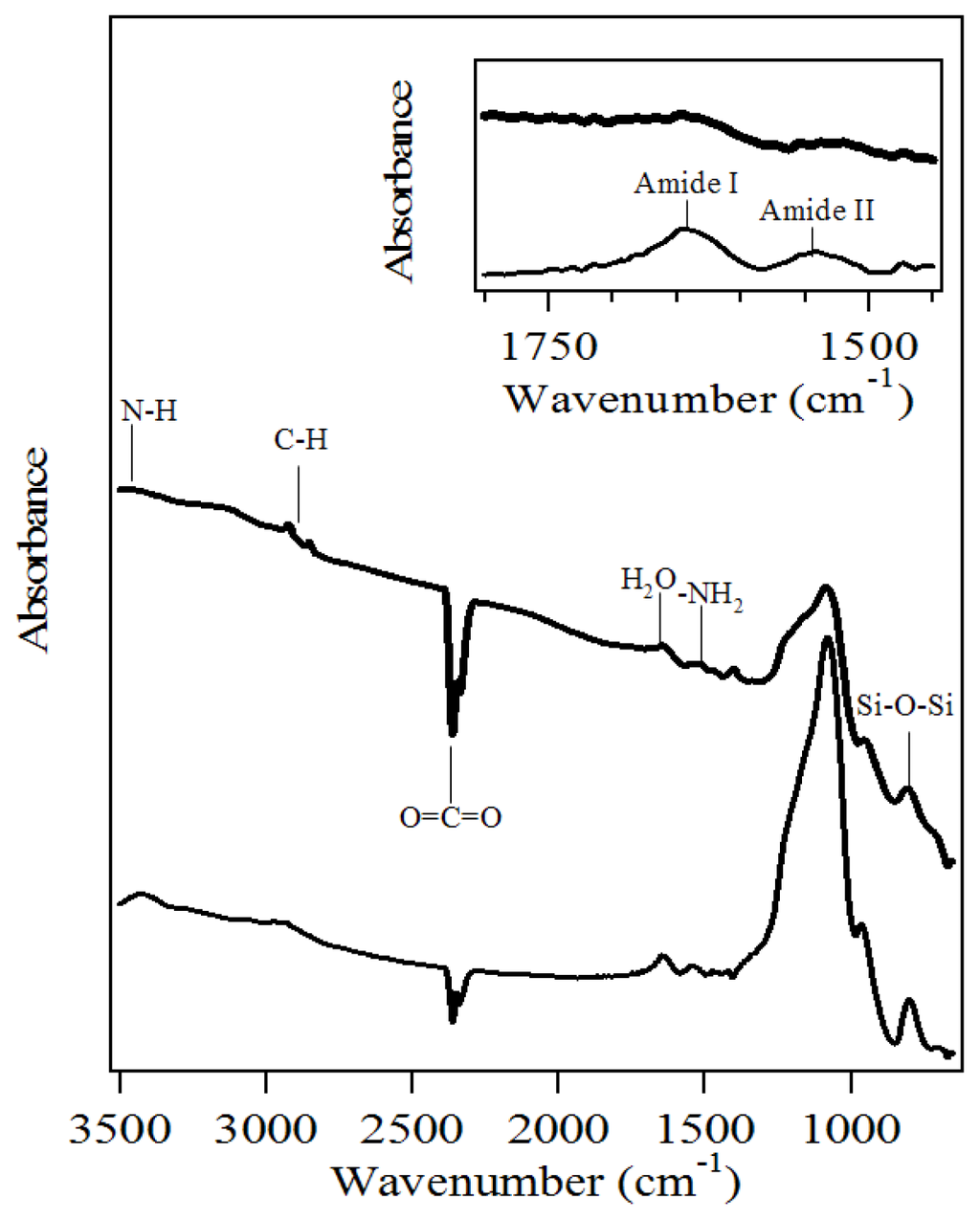 2.2. Assignment of UV/VIS and FTIR Spectra of Amino-Functionalized Mesoporous Silica after Adsorption Myoglobin