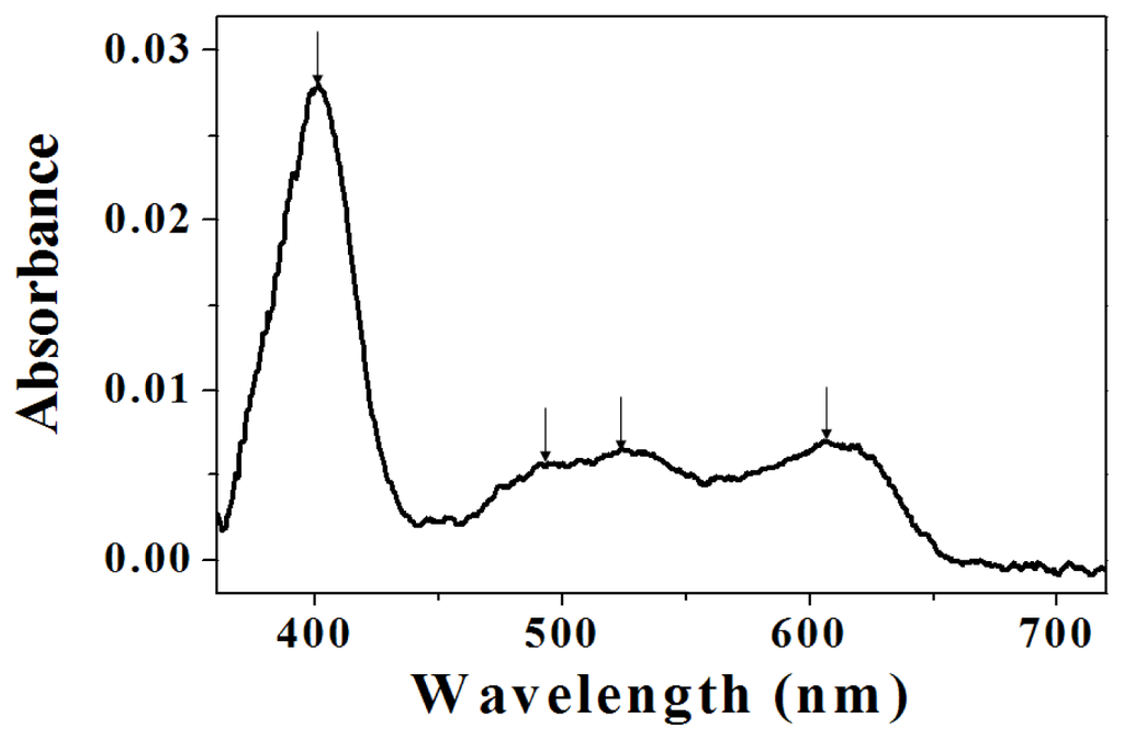 In UV/VIS spectroscopy, the UV absorbance of amino-functionalized mesoporous silica acted as the baseline (Figure 5). The intensive peak at around 400 nm was assigned to the soret-band of porphyrin [24]. The two weak peaks at around 500 nm and one weak peak at 600 nm were assigned to the Q-band of porphyrin, respectively [25]. These peaks exhibited characteristic absorption of heme of myoglobin. The UV/VIS spectroscopy verified that myoglobin was successfully adsorbed into amino-functionalized mesoporous silica.