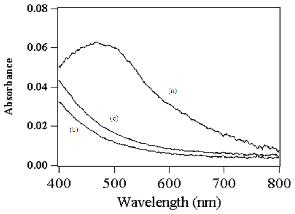 UV/VIS spectra of product produced by adsorbed myoglobin (a); amino-functionalized mesoporous silica (b) and amino-functionalized mesoporous silica linked by lysozyme without myoglobin (c).