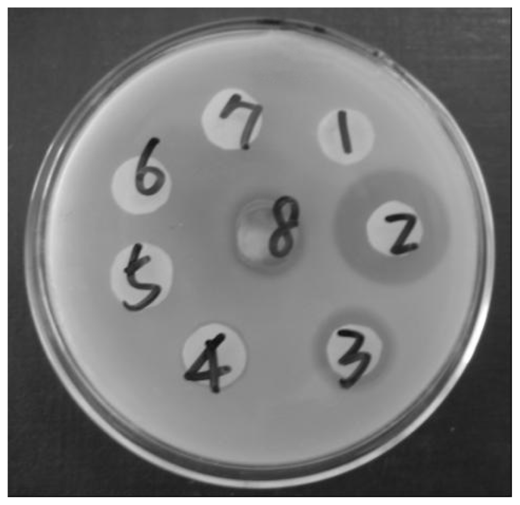 Antibacterial assay of sample: (1) amino-functionalized mesoporous silica adsorbed myoglobin; (2–7) the supernatant obtained from washing the final immobilized enzyme over four times; (8) the final immobilized enzyme.