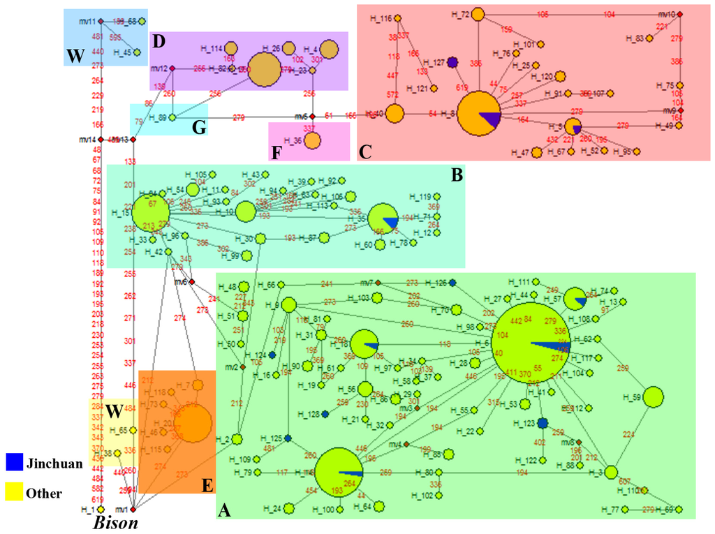 - Lai, S.J.; Liu, Y.P.; Liu, Y.X.; Li, X.W.; Yao, Y.G. Genetic diversity and origin of Chinese cattle revealed by mtDNA D-loop sequence variation. Mol. Phylogenet. Evol 2006, 38, 146–154. [Google Scholar]