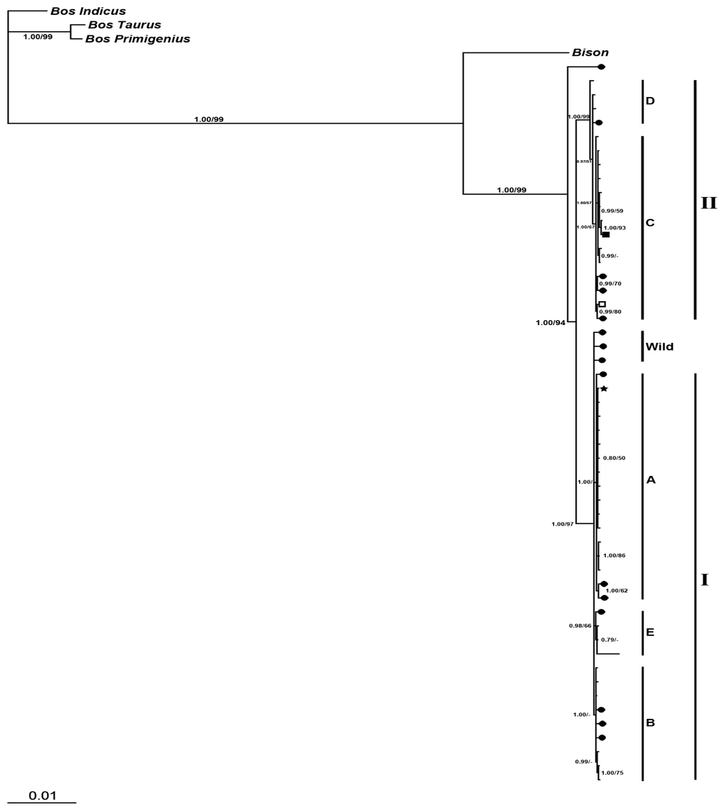 - Wang, Z.; Shen, X.; Liu, B.; Su, J.; Yonezawa, T.; Yu, Y.; Guo, S.; Ho, S.Y.W.; Vila, C.; Hasegawa, M.; et al. Phylogeographical analyses of domestic and wild yaks based on mitochondrial DNA: New data and reappraisal. J. Biogeogr 2010, 37, 2332–2344. [Google Scholar]