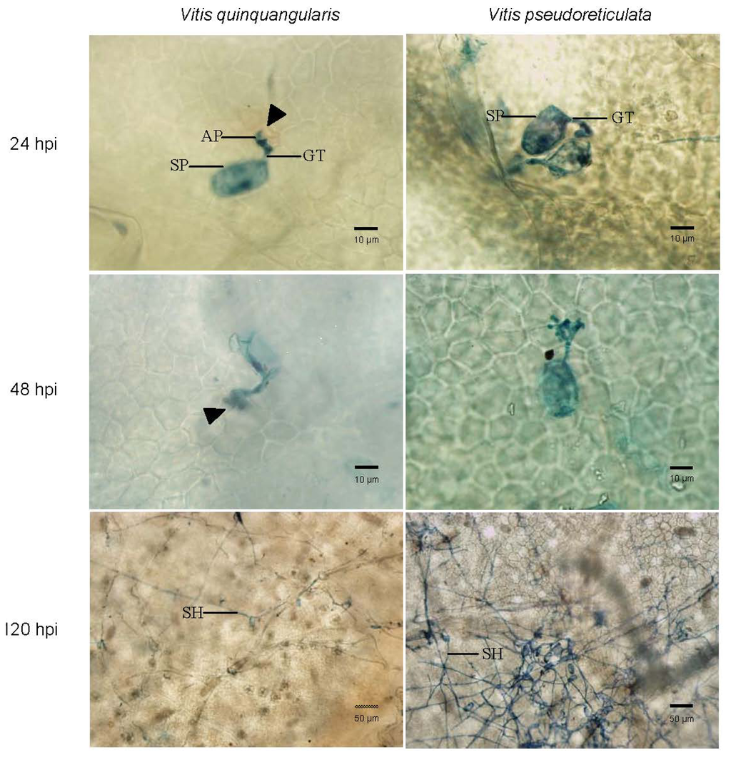 Powdery mildew fungus enters the epidermal cells of the leaf via conidiospores and the formation of a primary hypha is an indication of successful cell penetration and the establishment of a compatible interaction. Conidiospores produced germ tube and appressoria on both V. quinquangularis and V. pseudoreticulata leaves at 24 hpi, and a similar finding was reported in a previous study [4]. Recently, a microscopy study of the infection process of E. necator showed that appressorium formation, host cell penetration, and primary hypha formation took place during the period from 12 to 48 hpi in the susceptible V. vinifera Cabernet Sauvignon [1].