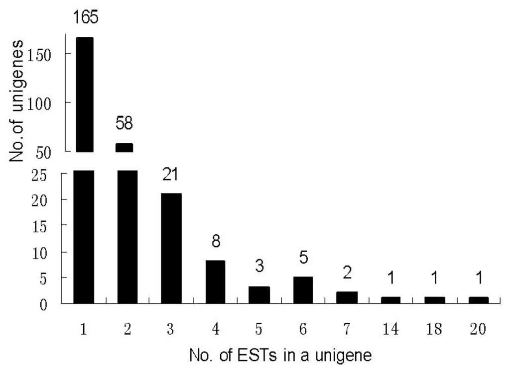 To identify genes that are potentially involved in V. quinquangularis clone “Shang-24” resistance to E. necator, an SSH library was constructed with mock-inoculated “Shang-24” leaves as the driver and E. necator-inoculated leaves as the tester. A total of 605 clones from the SSH library were selected and PCR analysis of white E. coli colonies containing cDNA inserts in the pGEM-T Easy vector showed that the size of the cDNA inserts ranged from 150 to 1000 bp. This confirmed the quality of the subtracted cDNA library. A total of 526 clones were identified to contain inserts larger than 200 bp, and were selected for sequencing. After removing low quality sequences and sequences of bacterial origin, 492 high quality ESTs ranging between 200 and 1000 bp were obtained. These ESTs were further assembled into 266 unigenes, among which 101 were contigs and 165 were singletons (Table S1). The number of EST members in unigenes varied from one to 20 (Figure 2), with the majority of unigenes present in low copy numbers.