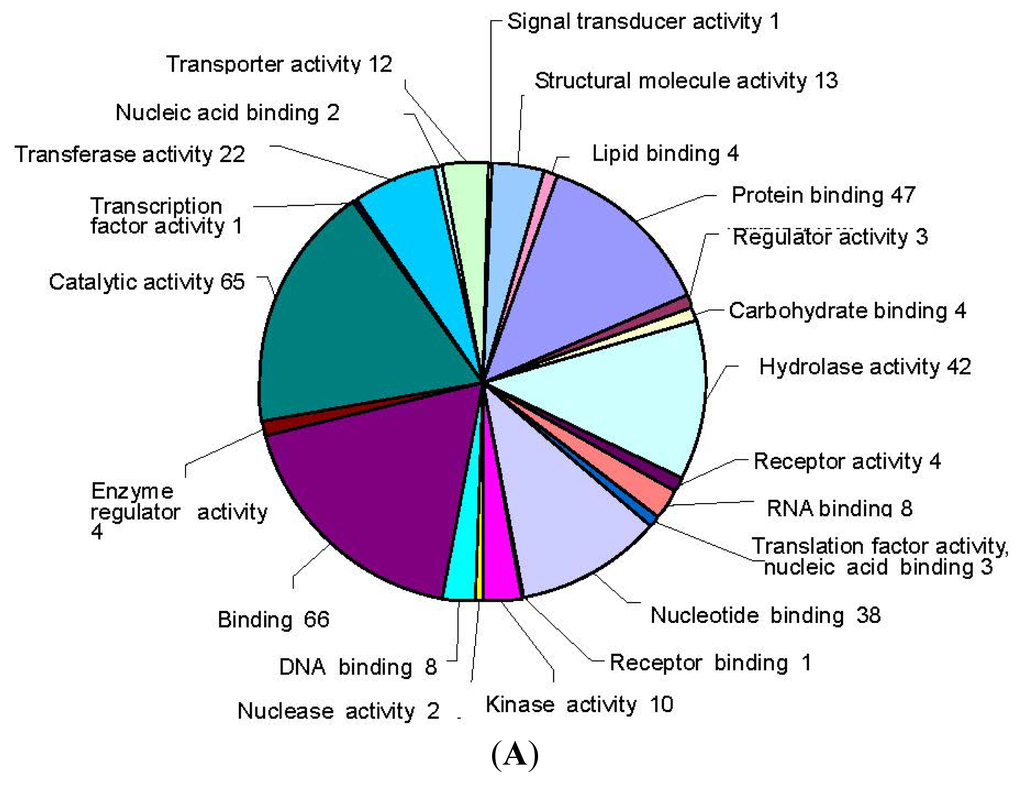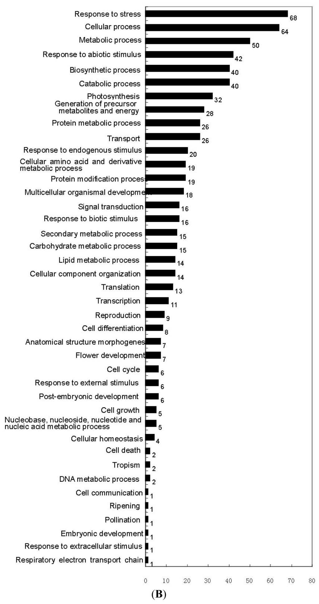 The unigenes from E. necator-inoculated grapevine leaves were further assigned gene ontology (GO) terms. Based on the GO annotations, unigenes were classified into high-level plant specific GO slims within the two ontology categories, namely, molecular function and biological process. A total of 176 unigenes were assigned to 22 GO slims within the molecular function category and 188 unigenes to 41 GO slims within the biological process category (Figure 3). Within the molecular function category, catalytic activity and binding were the most abundant GO slims (Figure 3A). Response to stress was the most abundant GO slim within the biological process category, which contained responses to stress, abiotic stimulus, and chemical stimulus, which is consistent with the fact that the unigenes were derived from tissues subjected to E. necator inoculation in Chinese wild V. quinquangularis (Figure 3B).