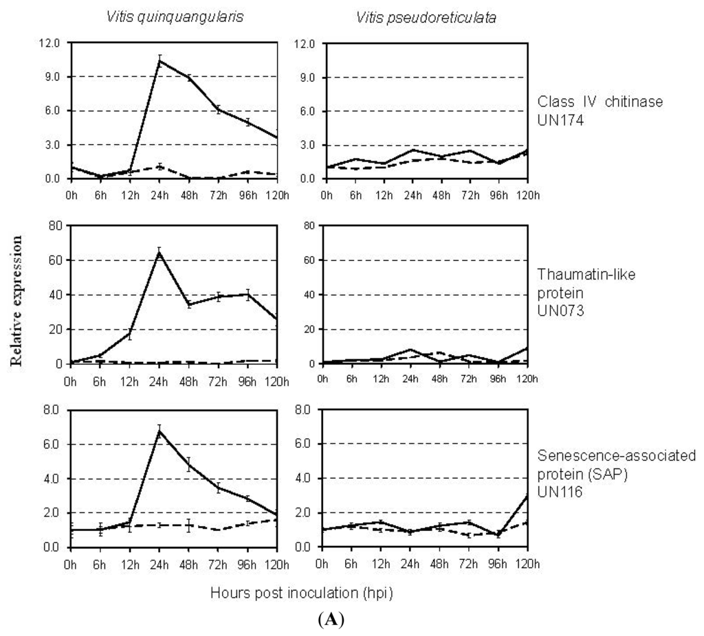 Representatives of this category are genes encoding PR proteins, such as chitinase, TLP, PR-10, and LTP. PR proteins were proven to be associated with plant resistance to various pathogens and abiotic stresses and classified into 17 families [15,16]. In this study, a chitinase gene (UN174) was identified in the SSH library. Chitinases, which belong to the PR-3 family and are an indicator of the systemic acquired resistance (SAR) response, can provide defense against fungal pathogens by degrading fungal chitin following initial penetration of the pathogen into the intercellular space. It has been reported that released chitin might trigger a more generalized defense response in plant tissues [17], therefore the consistently higher expression of the chitinase gene in both resistant and susceptible grapevines in our study suggested that this gene might be involved in generalized defense responses (Figure 4A).