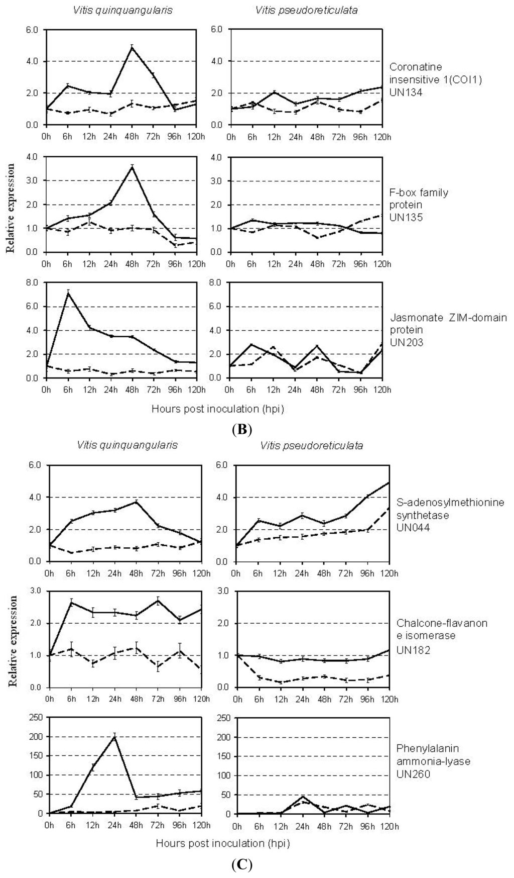 It is noteworthy that our finding was quite different from that observed in the grapevine-PM interaction in previous studies [1,4] and from the result in cauliflower that the expression induction of the defense-related genes, such as plant defensin gene PDF1.2, lipid transfer protein, and thioredoxin, was quicker and more intense in the susceptible line in response to pathogen, while in resistant line the reaction was delayed and limited [14]. A possible explanation is that resistance in V. quinquangularis involves the specific modulation of numerous transcripts that interacted with PM, such as transcripts encoding components of signal transduction cascades, hypersensitive reaction markers and genes involved in jasmonate biosynthesis (Figure 4B), while the limited transcriptional modulation in V. pseudoreticulata represents a weak attempted defense response rather than the activation of compatibility-specific pathways observed in V. vinifera and the susceptible cauliflower [1,4,14].