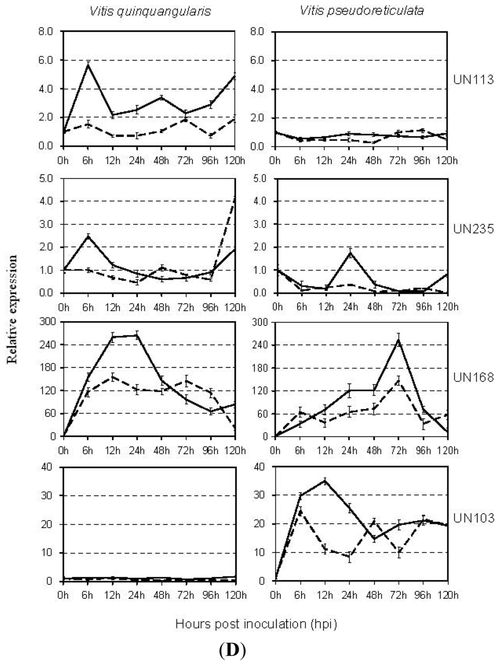 Real-time quantitative RT-PCR analysis of transcript accumulation in two grapevine genotypes in response to E. necator at 0, 6, 12, 24, 48, 72, 96, and 120 hpi. Data represents means of triplicate data. Expression profiles of genes in the disease/defense category (A); genes involved in Ubiquitin/26S proteasome pathway (B); genes in the metabolism category (C); and genes with no known homologs (D) are shown. Solid line, E. necator-inoculated samples; dashed line, mock-inoculated samples.
