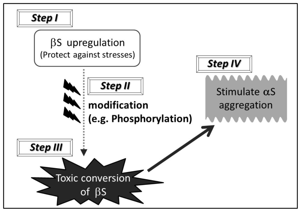 At present, it is unknown whether “toxic gain of function” of wild type βS is indeed the case for the pathogenesis of sporadic α-synucleinopathies. In this regard, we propose a hypothetical multiple-step mechanism (steps I–IV) through which wild type βS might stimulate the axonal pathology of α-synucleinopathies in human brains (Scheme 1). In the initial phase, βS might be accumulated in the presynapse (or distal axon) due to genetic factors, environmental factors, and aging. In particular, given the neuroprotective effect of wild type βS, βS might be upregulated to protect against increasing stresses, such as oxidative stress and chronic inflammation, during the course of aging (step I). Accumulated βS might then gradually undergo posttranslational modifications, such as phosphorylation and glycosylation, particularly in the C-terminal region (step II). As a consequence, a small amount of wild type βS with extensive modifications might adopt altered structures (e.g., toxic oligomers, protofibrils) due to aberrant regulation of the C-terminal region. This step may be regarded as “transformation” of βS from a neuroprotective to a neurodegenerative molecule (step III). Then, wild type βS with an altered structure may sequester αS, further stimulating the process of αS aggregation. Once aggregation of αS starts, amyloidogenesis of αS might proceed even in the absence of βS (step IV). Overall, alteration of βS might be involved in the early stage of the amyloidogenesis of αS, whereby altered βS may interact with αS, resulting in initial seeding of aggregated αS and leading to promotion of αS pathology.