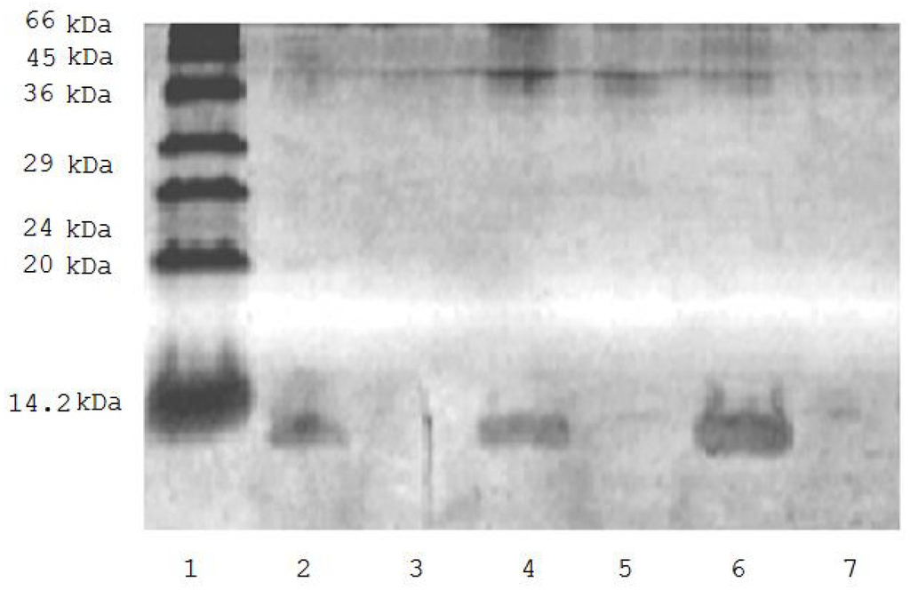 SDS-PAGE of solution of biotinylated ubiquitin before (tracks 2, 4, 6) and after incubation (tracks 3, 5, 7) with avidin-agarose. 1. low molecular weight markers; 2. 0.375 μg of biotinylated ubiquitin; 4. 0.75 μg biotinylated ubiquitin; 6. 0.150 μg of biotinylated ubiquitin; 3, 5, and 7 are the same as in 2, 4, and 6 but after incubation with avidin-agarose.
