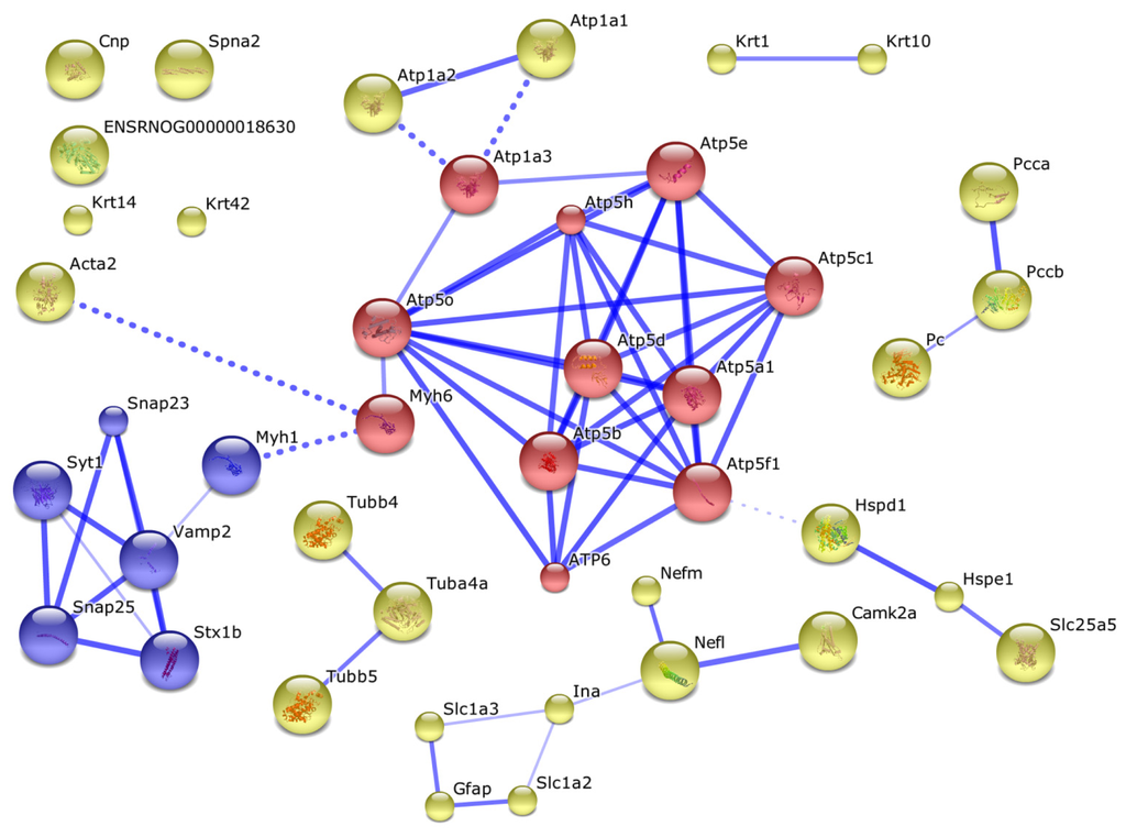 Prediction of interactions of proteins identified during the proteomic analysis was performed using an open access STRING version 9.0 software platform [48]. A list of identified proteins Uniprot/SwissProt IDs was used as input data and applied for interactive network processing. The confidence score at the level of 0.7 was chosen to view the best fitted proteins with approximate probability that a predicted link exists between selected proteins in the same metabolic map in the KEGG database. KMEANS clustering algorithm was selected for clustering the obtained proteins in the resultant network. The number of clusters was chosen as 5 and at least the confidence score of 0.9 was selected for each analyzing node in the resultant protein connectivity map.