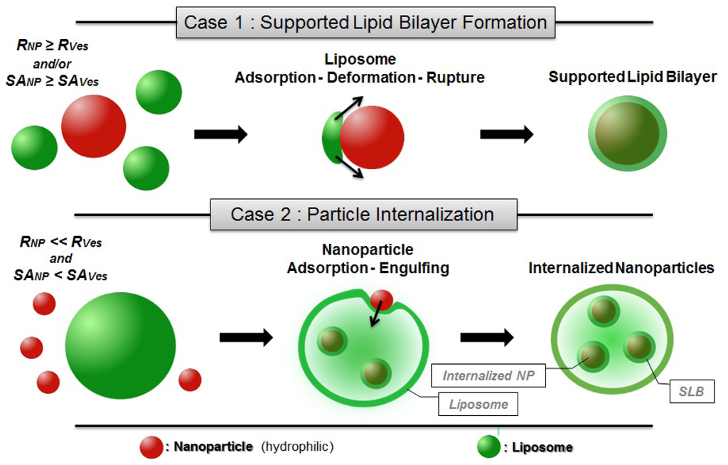 - In the second case, the formation of SLB on a particle is an intermediate step of the internalization mechanism in which particles covered with SLB become encapsulated within liposomes []. This may occur when RVes is considerably larger than RNP and SANP inferior to SAVes (Figure 2). The internalization of the nanoparticles is firstly driven by the attractive interaction between membrane and nanoparticle but in addition, a thermodynamic driving force is the release of water from the vesicle interior and the concomitant entropy gain that occurs during the process.