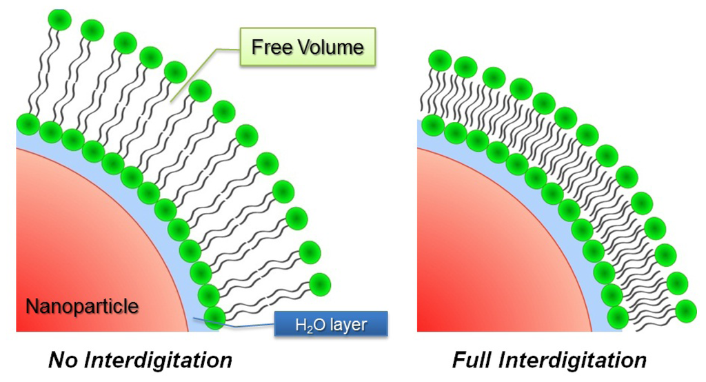 Interestingly, supported lipid bilayers adsorbed on small particles (RC < 100 nm) exhibit morphology changes due to the high curvature they experience. Shifts of the Tm value [] as well as a broadening and/or splitting of the transition peak obtained by differential scanning calorimetry (DSC) [,] suggest a curvature-dependent decoupling between the inner and outer leaflet of the bilayer as has also been observed in the case of small SUVs [,]. In extreme cases (RP ≤ 10 nm) the high curvature induces the creation of a large free volume between the acyl-chains of the supported bilayer [,] (Figure 3, left). In this case, interdigitation of the acyl-chains occurs in order to optimize hydrophobic interaction while avoiding the exposure of hydrophobic chains to an aqueous environment (Figure 3, right) [].