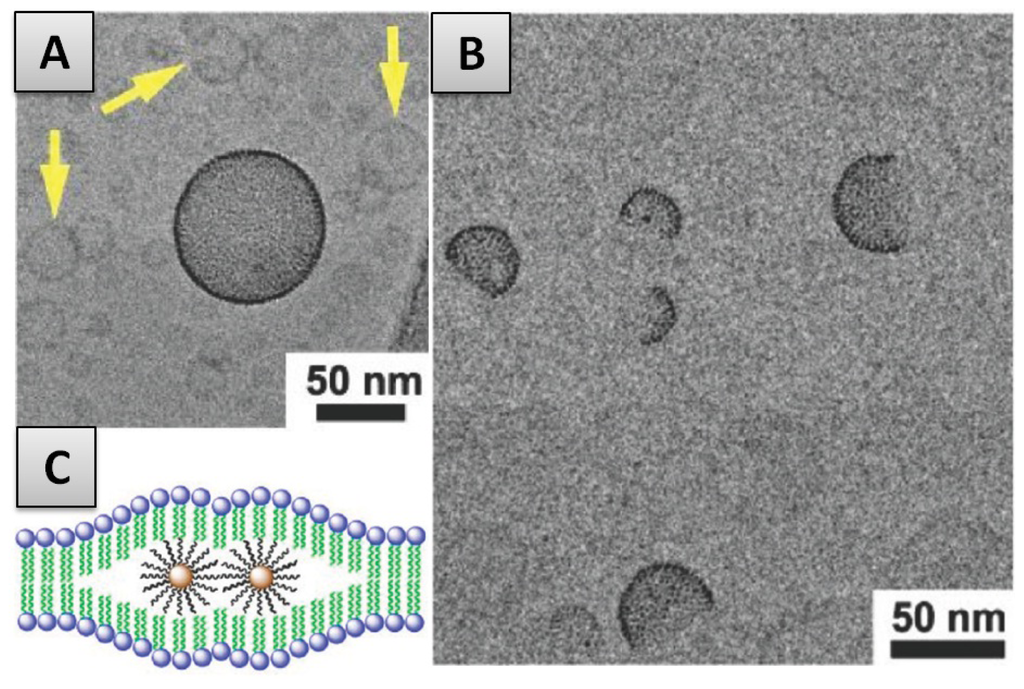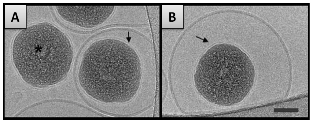 CryoTEM images of internalized silica hard nanoparticles (NPs) within DOPC (dioleylphosphatidylcholine) liposomes—visualization of the SLB on internalized particles (black arrow) and of “free” NP covered only with a SLB (asterisk). Scale bar 50 nm. Figure reprinted from [].