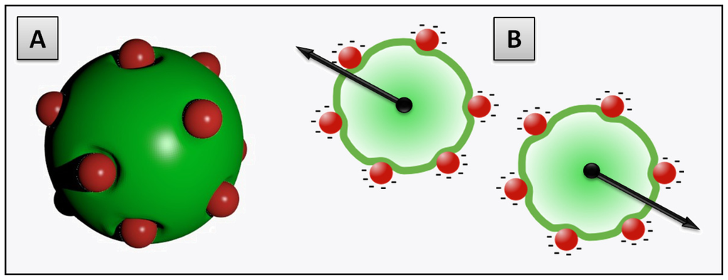 On the contrary, if the NP concentration is too low, nanoparticles would bridge between adjacent liposomes, thereby introducing interactions and thus accelerating their fusion [,], as has been observed in nanoparticle-microsphere systems []. In order to limit the magnitude of this effect, one may change the sign and magnitude of the particle charge. As has been found for PC liposomes, the use of cationic particles allows colloidal stabilization at lower surface coverage as compared to anionic ones []. In fact, cationic particles adsorb weakly on the membrane due to the geometry of the P−–N+ dipole of the lecithin head group (Figure 7), and consequently, they are less apt to bridge between neighbouring liposomes. These results confirm the predictions made by computer simulations on analogous systems [,].