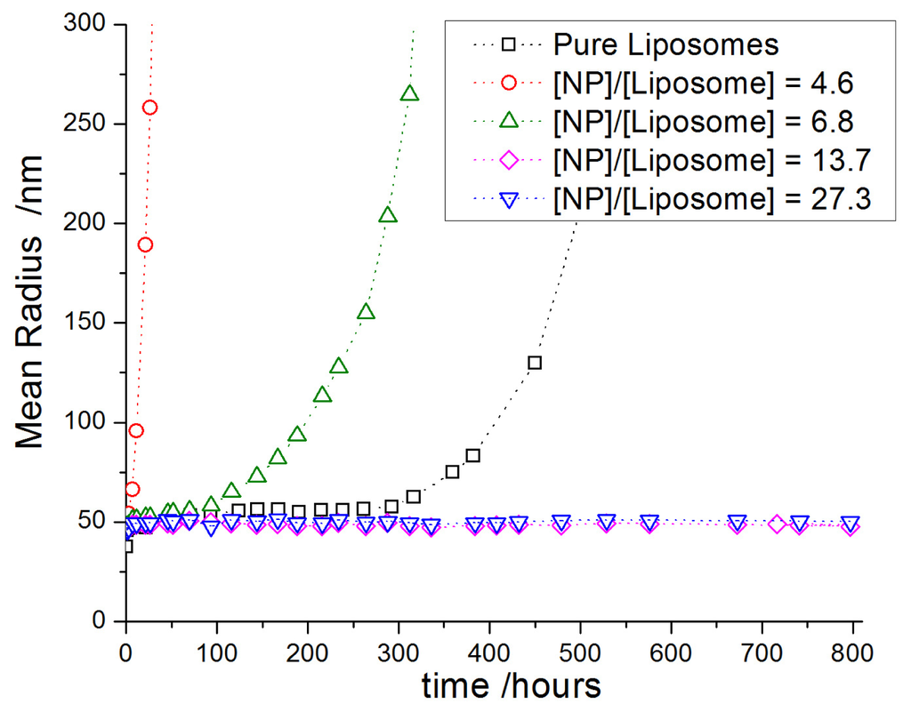 This has similarly been observed in recent work by us as documented by the change of particle size as a function of time (Figure 6). This study on the stability of unilamellar DPPC vesicles (R ~ 50 nm) below their phase transition temperature by means of dynamic light scattering showed that the addition of small amounts of small silica NPs (Rh ≈ 8 nm) leads to a rapid destabilization of the vesicle dispersion []. Only the adsorption of a sufficiently high amount of silica particles onto the liposome surface, here about 14 NPs per vesicle, is able to prevent the fusion of neighbouring liposomes and ensure their colloidal stability for several months. This is an enormous enhancement compared to the situation of the unmodified vesicles and such long-time stability is very important for the storage of liposome dispersions and also for having controlled release properties.