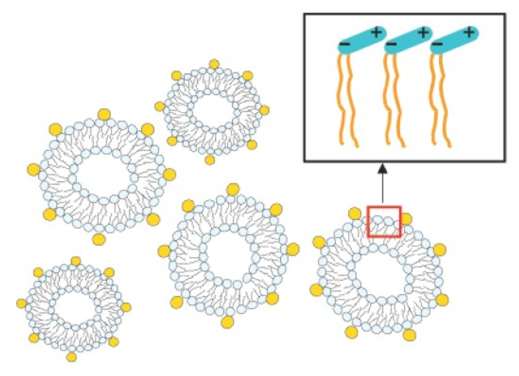 Schematic illustration of a DLPC (dilauroylphosphatidylcholine) liposome suspension stabilized by nanoparticles (not to scale). The inset shows a schematic diagram of the P−–N+ dipolar headgroup of a zwitterionic lipid. Therefore, an anionic nanoparticle, with electric charge opposite to that of the outermost portion of the lipid headgroup adsorbs more strongly than a cationic nanoparticle. Figure reprinted and adapted with permission from [].