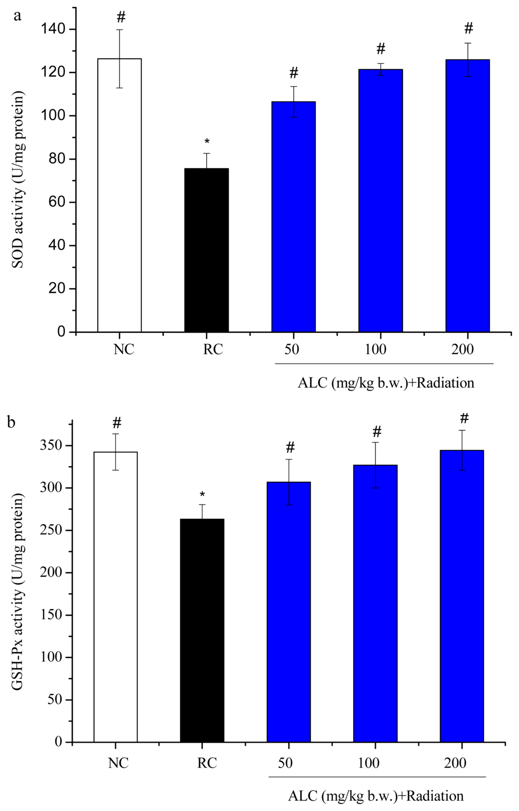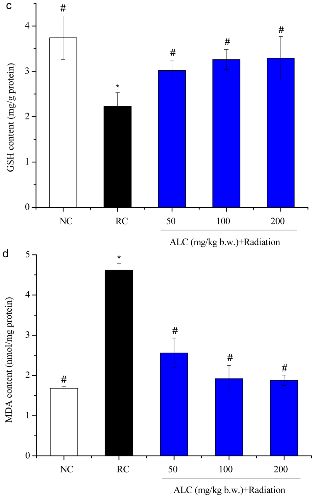 Fifty ICR mice were randomly divided into five groups of 10 animals each, namely, normal control group (NC group), radiation control group (RC group), ALC treatment + radiation group (ALC1, ALC2 and ALC3group). Mice in the ALC-1/2/3 groups were given a daily intragastric administration based at doses of 50, 100, and 200 mg/kg body weight per day for 14 consecutive days. The NC group and NC group were administered with double distilled water. Body weight changes of the mice in all groups were monitored every 24 h. After continuous administration for two weeks, all mice, except the NC group, were exposed to 60Coγ-ray for whole-body radiation. Mice were sacrificed by cervical dislocation, 24 h after radiation. Tissues were removed immediately and frozen with liquid nitrogen and stored at −80 °C.