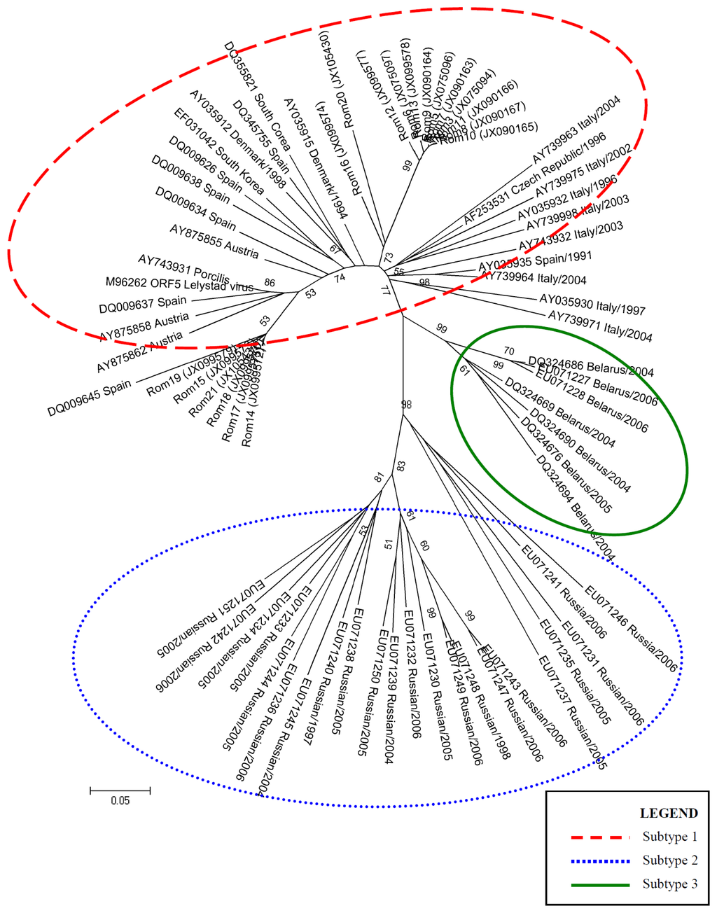 The phylogenetic tree constructed, based on ORF5 gene (Figure 2), shows that all Rom isolates cluster within the type 1 PRRSV strain, indicating a high similarity with other virus strains belonging to the subtype 1.