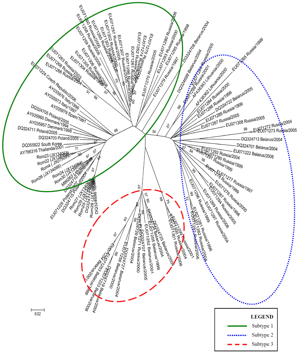 In our phylogeny study on ORF5 gene, we used Maximum Likelihood method with gamma distribution. In the analysis of the phylogenetic tree, we identified three major clades according with the three subtypes indicated by Stadejek et al. [10]. The isolates from Russia are included in subtype 2, from Belarus are included in subtype 3, and Romanian sequences were distributed in a monofiletic group according to subtype 1 from Type 1. In this group, our Romanian sequences: Rom11, 10, 8, 3, 7, 5, 9, 13, 6, 12, 16 and 20 form a distinct clade. The Romanian sequences Rom15, 21, 18, 17, 14 and 19 form a clade with the sequences from Spain, Austria, Lelystad virus and Porcilis vaccine.