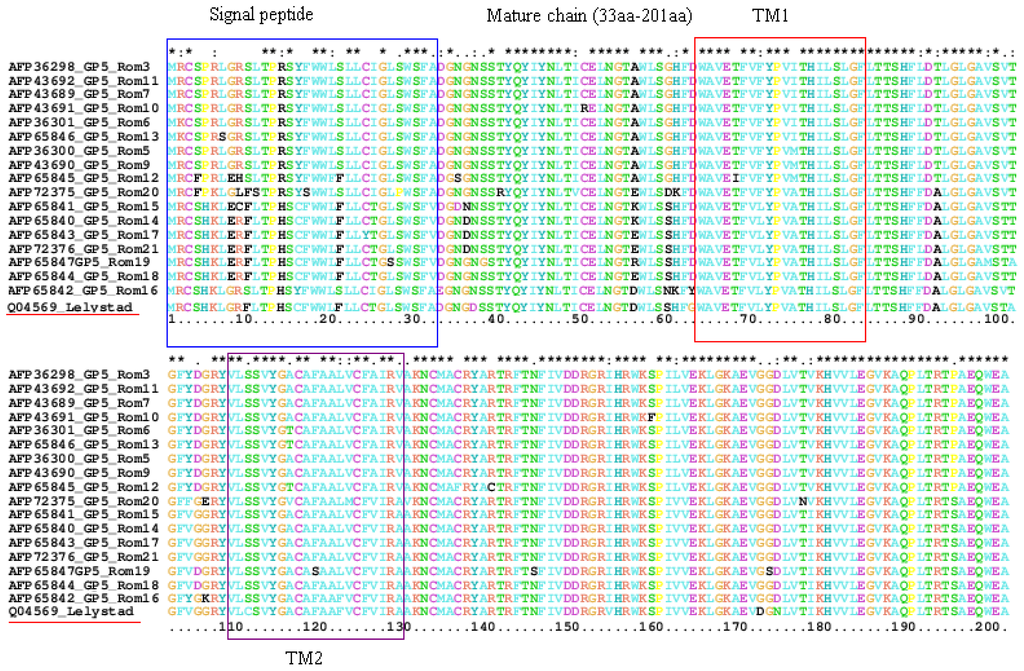 The amino acid sequences of GP5 (201 amino acids) divided into signal peptide (1st aa to 32nd aa) and the mature chain (33rd aa to 201st aa). The mature chain contains two transmembrane elements (TM1—64th aa to 84th aa, TM2—109th aa to 129th aa).