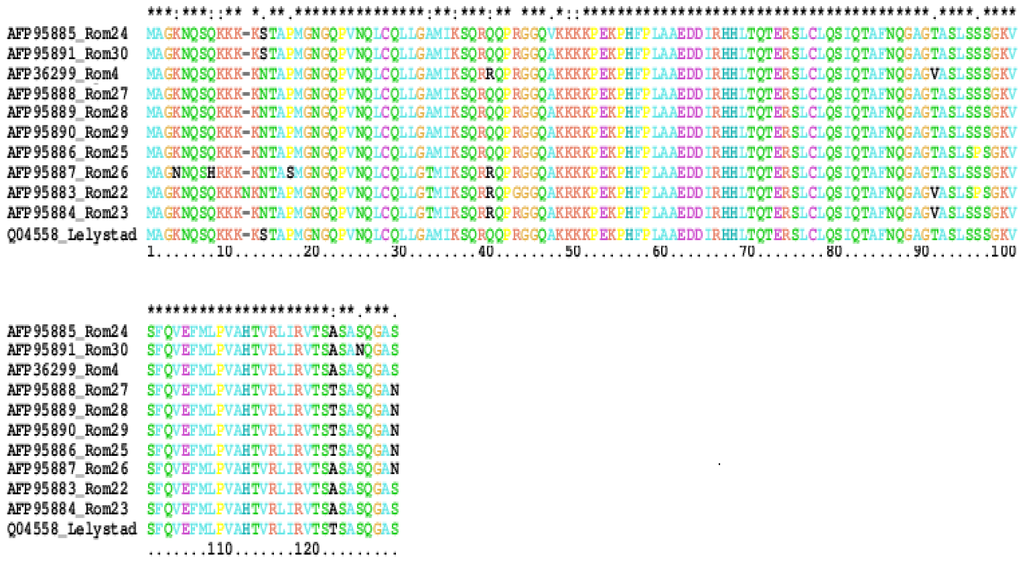 The distribution of sequence diversity across the ORF7 protein was investigated for all 10 sequences analyzed in this study. The analysis sequences which contains 128 amino acids demonstrate that Romanian isolates have some amino acid substitutions compared with Lelystad virus: Rom22 isolate with an asparagine inserted between positions 11 and 12 of the alignment, and one substitution in position 42, Rom26 with three amino acid substitutions in positions 4, 8 and 16 and Rom30 with one amino acid substitution in position 124 (Figure 5).