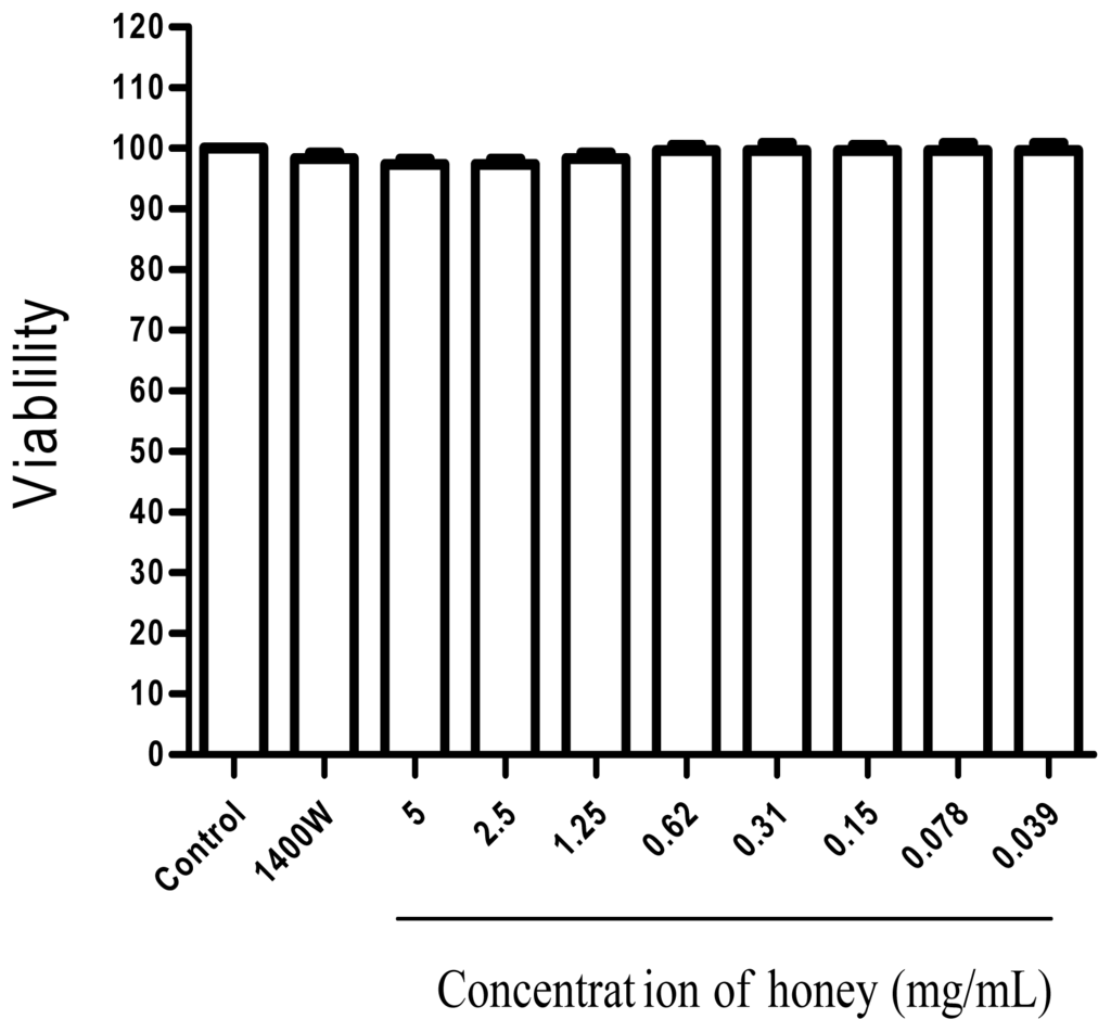 Effect of honey and the iNOS inhibitor 1400W on the viability of RAW 264.7 macrophages. Cells were treated or not treated (control) with the indicated concentrations of honey or 100 μM 1400W. Cell viability was determined by the mitochondrial reduction of 3-(4,5-dimethylthiazol-2-yl)-2,5-diphenyltetrazolium bromide (MTT). Data are expressed as the mean ± SEM of five independent experiments performed in triplicate. The viability of untreated cells was defined as 100%.