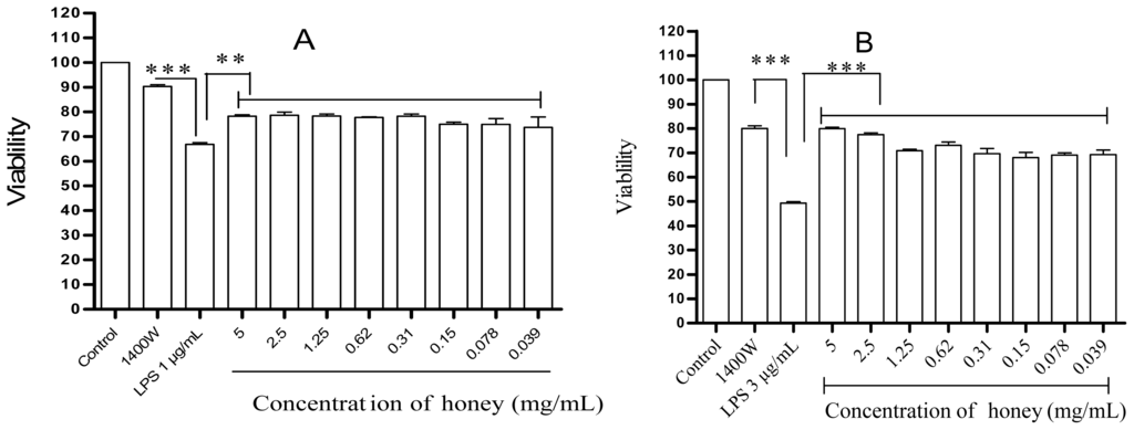 In contrast, as shown in Figure 2A, pretreatment with honey had a protective effect on LPS/IFN-γ-stimulated cells, significantly increasing their viability to >76% (p < 0.03), whereas the viability of cells pretreated with 1400W was >90% (p < 0.001). Increasing the LPS concentration to 3 μg/mL significantly reduced the viability of the untreated cells to <50% of the control value, whereas the addition of honey increased viability to >69% (p < 0.001), and the addition of 1400W resulted in >79% viability (p < 0.001) (Figure 2B).