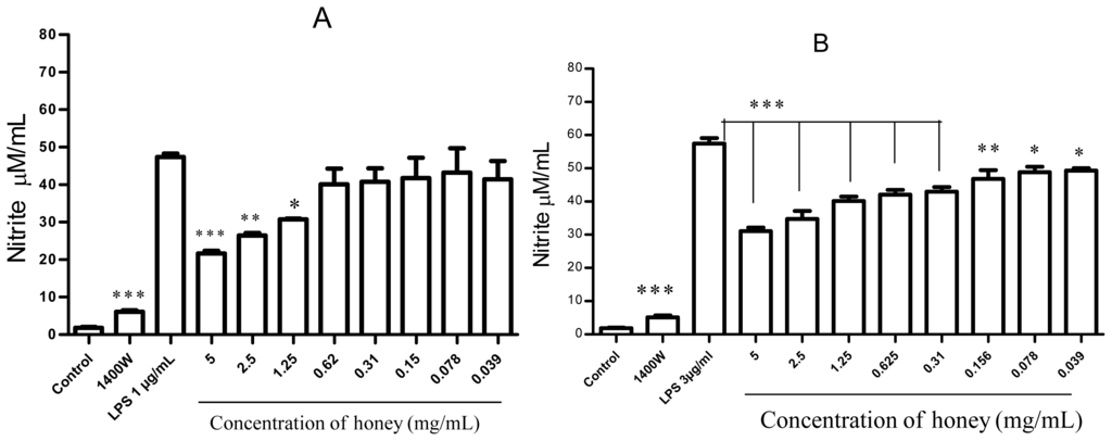 Honey also significantly inhibited NO formation in cells that were stimulated with the indicated concentration of LPS (1 μg/mL or 3 μg/mL). A dose-dependent effect was observed at higher concentrations of honey (Figure 3).