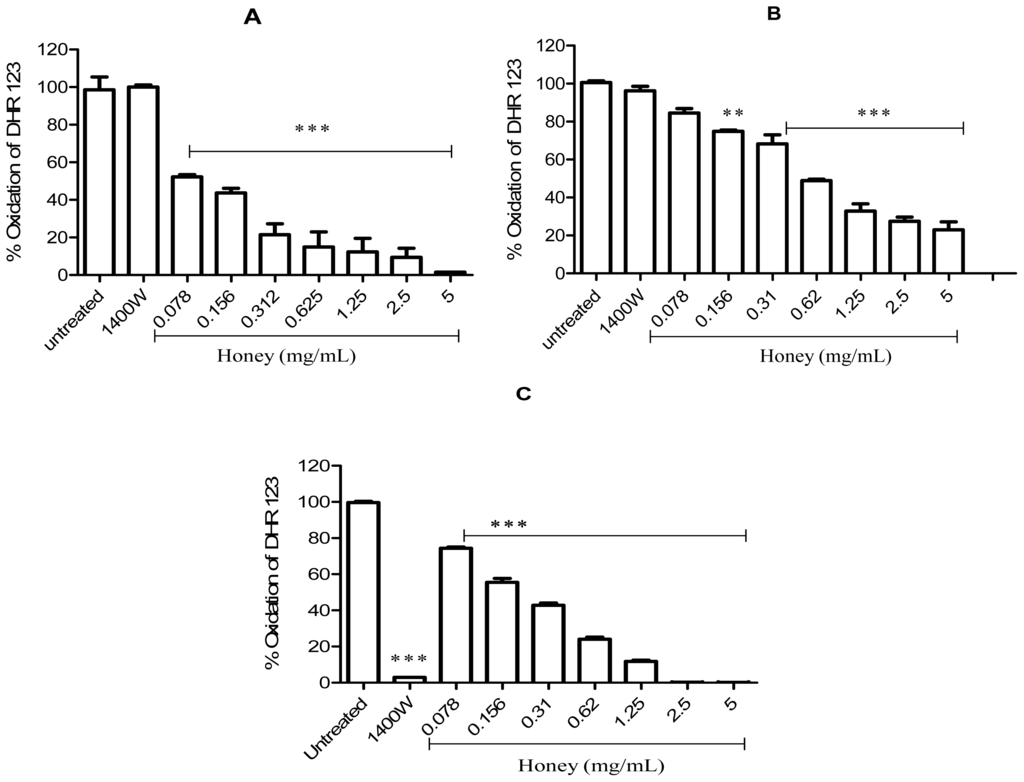 Effect of honey on the peroxynitrite-induced oxidation of DHR-123. (A) SIN-1, a peroxynitrite donor, was incubated for 2 h with different dilutions of honey (in PBS), 1400W (100 μM), and DHR-123, and the formation of rhodamine 123 was measured; (B) Honey (different dilutions in PBS) or 1400W (100 μM) were incubated for 15 min with DHR-123 and peroxynitrite, and the formation of rhodamine 123 was measured; (C) RAW 264.7 cells were incubated with honey (different dilutions in PBS), 1400W (100 μM), and DHR-123 for 60 min. Then, LPS/IFN-γ was added, and the cultures were incubated for an additional 24 h, after which the formation of rhodamine 123 was measured. Results are expressed as a percentage of the control (mean ± SEM of 3 independent experiments performed in triplicate). *** p < 0.001 and ** p < 0.003. Rhodamine 123 formation in the untreated control was defined as 100%.
