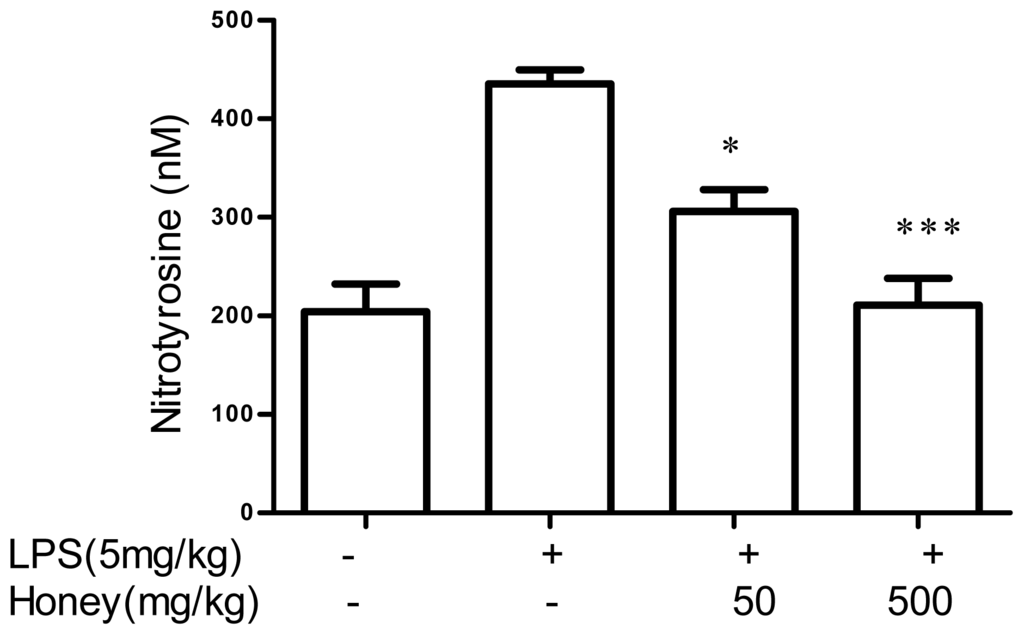 Pretreatment with 50 mg/kg or 500 mg/kg of honey also significantly inhibited peroxynitrite formation in rats, albeit not in a dose-dependent manner. Inhibition was determined by a reduction in 3-nitrotyrosine, which is an in vitro marker of peroxynitrite (Figure 5).