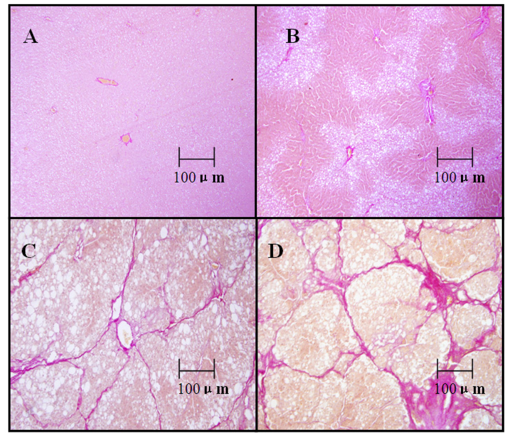 Van Gieson’s staining clearly showed that little collagen was distributed around the blood vessel wall or bile duct wall in livers of control rats (Figure 1A). Thin collagen fibers were observed in liver rats with fibrosis starting from the 4th week (Figure 1B). At the 8th week, the hepatic lobule was incompletely enveloped by thin collagen fibers (Figure 1C). The liver damage progressed further at the 12th week, showing a larger accumulation of fibrous connective tissue and the formation of typical pseudolobules (Figure 1D).