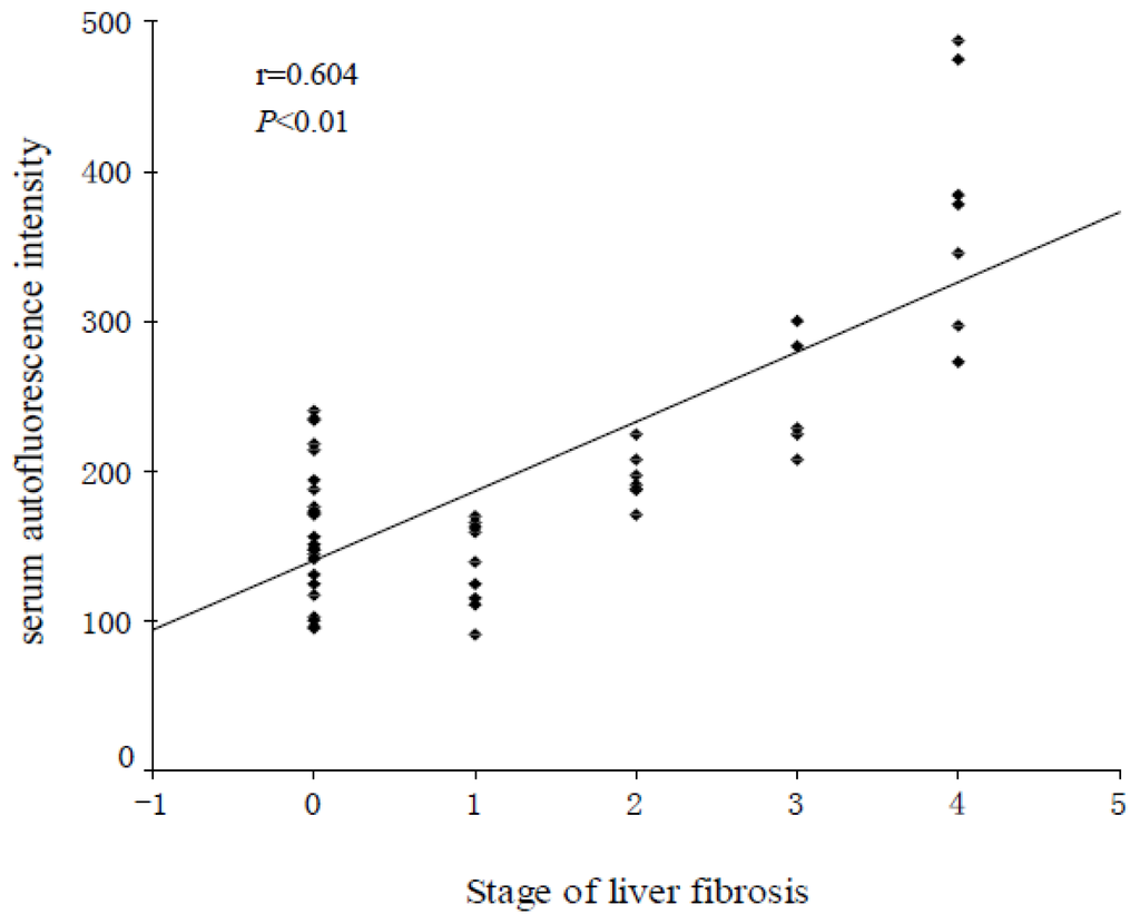 Figure 2 shows that the serum AF intensity increased gradually with the progression of hepatic fibrosis, and correlated positively with hepatic fibrosis (r = 0.604, p < 0.01).