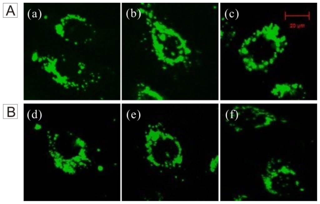 - Jose, J.; Loudet, A.; Ueno, Y.; Wu, L.; Chen, H.Y.; Son, D.H.; Barhoumi, R.; Burghardt, R.; Burgess, K. Energy transfer cassettes in silica nanoparticles target intracellular organelles. Org. Biomol. Chem 2011, 9, 3871–3877. [Google Scholar]