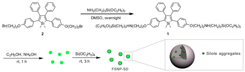- Faisal, M.; Hong, Y.; Liu, J.; Yu, Y.; Lam, J.W.Y.; Qin, A.; Lu, P.; Tang, B.Z. Fabrication of fluorescent silica nanoparticles hybridized with AIE luminogens and exploration of their applications as nanobiosensors in intracellular imaging. Chemistry 2010, 16, 4266–4272. [Google Scholar]