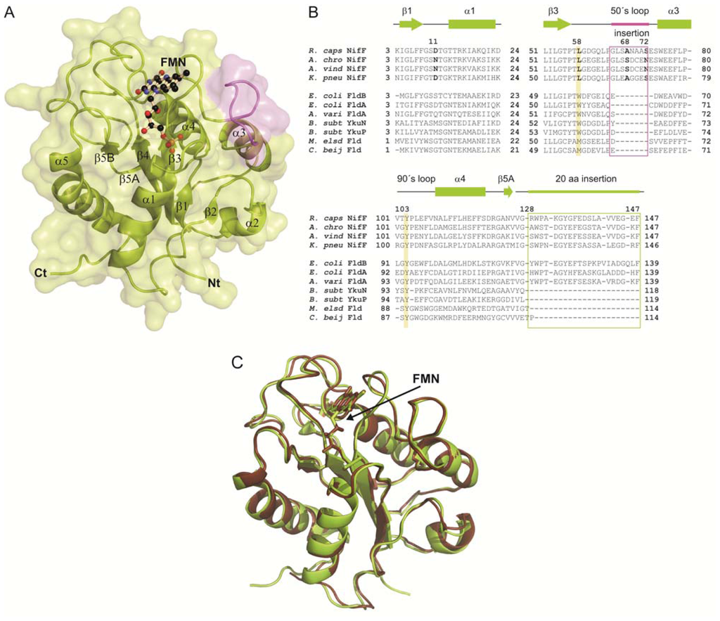 Three-dimensional structure of NifF and sequence alignment. (A) Secondary elements and transparent surface of Rc-NifF appear in green, except for the insertion at the C-terminal end of the 50’s loop (α3–β3 loop) that is highlighted in magenta. The FMN is represented as balls and sticks in beige; (B) Sequence alignment of most remarkable segments of NifF from R. capsulatus with flavodoxins from A. chroococum, A. vinelandii and K. pneumoniae (nif dependent flavodoxins) and from E. coli (FldB and FldA), A. variabilis, B. subtilis (YkuN and YkuP), M. elsdenii and C. beijerincki. Residues involved in isoalloxazine stabilization are colored, and both insertions, one at the 50’s loop and the characteristic twenty-amino acids insertion characteristic of long chain flavodoxins are marked in a boxes; (C) Superimposition of Rc-NifF (in green) and Av-NifF(in brown). Polypeptide chains and FMN molecules are represented as cartoon and sticks, respectively.
