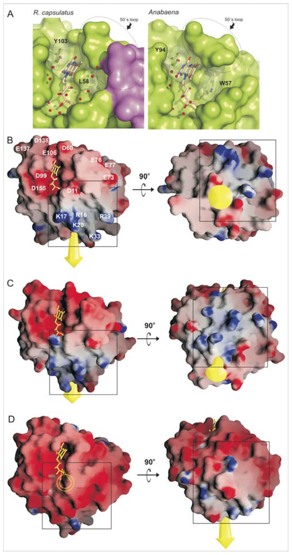 FMN environment and charges distribution. (A) Representation of the FMN-binding cavity in R. capsulatus and Anabaena Flds. The molecular surface of the polypeptide chain is shown in green, except for the eight-amino acids insertion of the 50’s loop in R. capsulatus Fld (colored in magenta). The FMN and the two residues packing with the isoalloxazine ring are represented in sticks, and water molecules appear as red spheres. Lower panels illustrate a comparison of the electrostatic potential surface of Rc-NifF (B) with the flavodoxins from A. vinelandii (C) and Anabaena sp. (D) In each case, the dipole moment appears represented as a yellow arrow (it appears empty when the vector is completely hidden, due to the orientation of the molecule). The black box signals the basic region found in the Rc-NifF around α1 helix and the equivalent in the other flavodoxins. In the case of R. capsulatus, acidic and basic residues located in the neighborhood of the FMN are labeled.