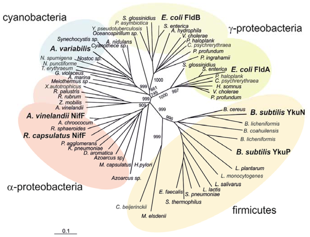 Phylogenetic relationships within the bacterial flavodoxins. The phylogenetic tree was constructed from 64 sequences using Neighbor-joining clustering method. Statistical support is represented as bootstrap numbers on the main branches. Four major groups including functional/structural prototypes are illustrated: α-proteobacteria (light red), γ-proteobacteria (green), cyanobacteria (blue) and firmicutes (brownish).