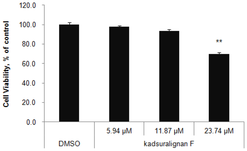 Effects of kadsuralignan F on the proliferation of melan-A cells. The cells were cultured with the indicated concentrations of kadsuralignan F for 3 days. Results are expressed as a percentage of the control (DMSO), and values are the average ± SE (standard error) of three determinations. **p < 0.01 vs. DMSO.