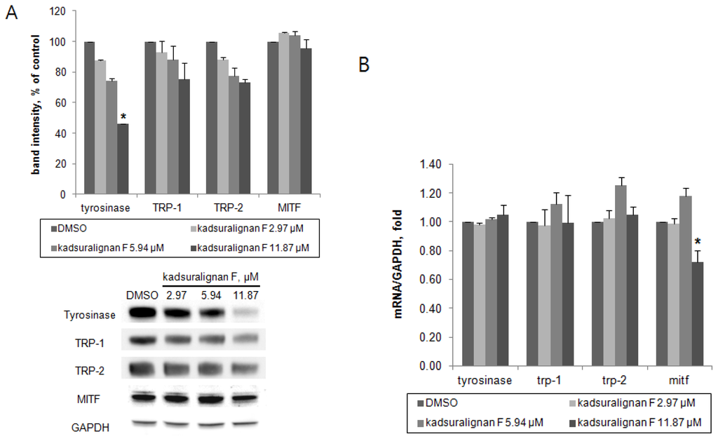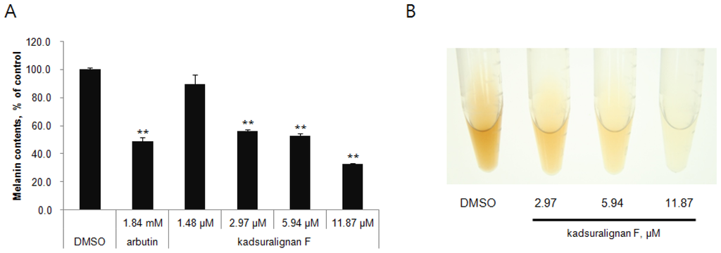 Quantification of melanin content indicated that kadsuralignan F significantly reduced the melanin synthesis in a dose-dependent manner (56% at 2.97 μM, 53% at 5.94 μM, and 33% at 11.87 μM) (Figure 3A). As shown in Figure 3B, the color of representative cell pellets clearly showed inhibitory activity of kadsuralignan F on melanogenesis, which became brighter with increasing concentration.