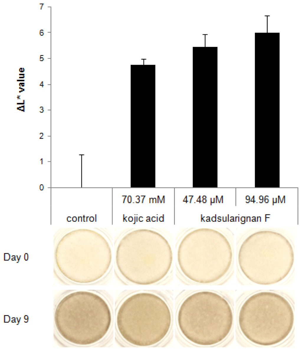 The skin-whitening ability of kadsuralignan F was also tested in human skin equivalents. After nine days of treatment, pigmentation of kadsuralignan F-treated skin equivalents was compared against controls which were treated with the same volume of DPBS. Kadsuralignan F treatment at 47.48 μM and 94.96 μM (20 ppm and 40 ppm, respectively), which showed no cytotoxicity on skin equivalents, increased the brightness of the tissues relative to the control (Figure 4). Human skin equivalents, such as MelanoDerm, can implement many biological reactions that appear in physiological human skin, including interactions between melanocytes and keratinocytes, and skin pigmentation. Therefore, in vitro biosystems such as these are widely applied in many studies to evaluate the whitening efficacies of cosmetic and pharmaceutical agents. The result demonstrated that kadsuralignan F would be more effective for skin whitening than kojic acid, a proven whitening agent used in the test as a positive control [28], as the ΔL* value of the skin equivalents treated with 47.48 μM of kadsuralignan F was equal to that treated with 1% kojic acid (70.37 mM).