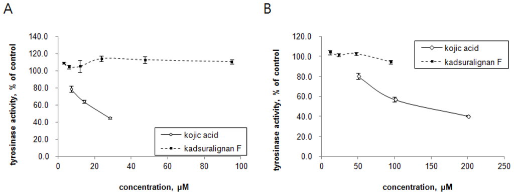 Since tyrosinase is the key regulatory enzyme for melanin production [5], the ability of kadsuralignan F on tyrosinase activity inhibition was investigated with mushroom tyrosinase and DOPA oxidase activity of mammalian tyrosinase. Tyrosinases from mushroom and melan-A cell extract were treated with different concentrations of either kadsuralignan F or kojic acid, and were incubated in the presence of substrates. In this cell-free assay system, we could try higher concentrations of kadsuralignan F compared to the cellular melanin assay, as it is more suitable for testing the direct inhibition of tyrosinase activity. As shown in Figure 5, kadsuralignan F had no significant inhibitory effect on tyrosine hydroxylase activity (Figure 5A) or DOPA oxidase activity (Figure 5B). Kojic acid, a well known tyrosinase inhibitor, suppressed both tyrosinase activities dose-dependently.