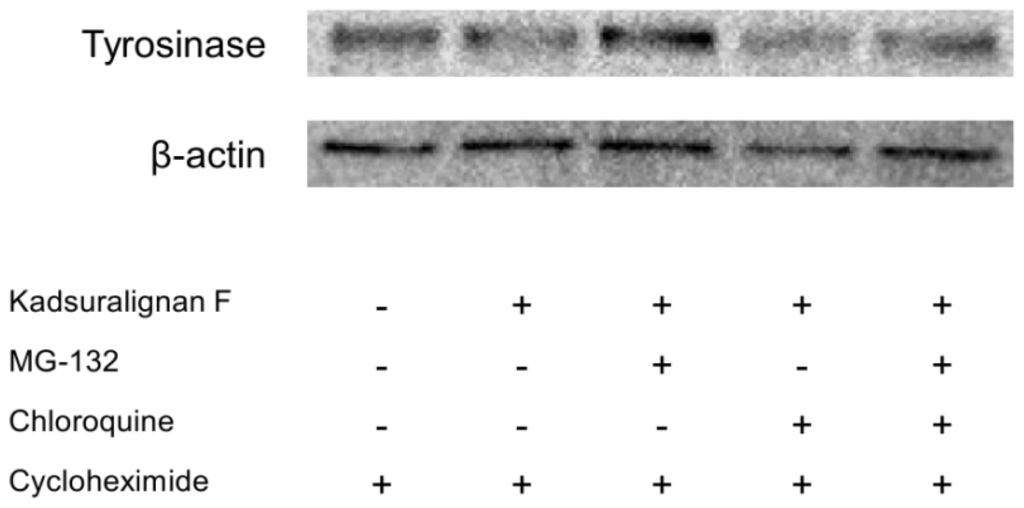 Tyrosinase is endogenously removed by the ubiquitin-mediated proteasomal degradation system [8]. Recent studies have reported that agents degraded tyrosinase via activation of the UPS resulting in the acceleration of tyrosinase degradation [9,29]. To investigate whether tyrosinase degradation by kadsuralignan F is involved in proteasomal or lysosomal pathway, analysis using proteolysis inhibitors was conducted. Tyrosinase degradation is mediated via proteasome, and this degradation could affect melanin synthesis in melanocytes [30]. For an evaluation of kadsuralignan F on post-translational tyrosinase degradation, we introduced MG-132, a proteasome inhibitor, and/or chloroquine, a lysosomal proteolysis inhibitor. After 24 h of serum starvation, melan-A cells were treated with cycloheximide to inhibit protein synthesis, and then the proteolysis inhibitors were added for 1 h followed by 6 h of kadsuralignan F treatment. It was found that the tyrosinase decrease due to kadsuralignan F treatment was recovered by pretreatment with MG-132. However, chloroquine treatment did not show any effect on the tyrosinase recovery (Figure 7). These results indicate that proteasomal tyrosinase degradation was mediated by kadsuralignan F treatment. Further study is needed to investigate the relationship between kadsuralignan F treatment and the ubiquitination of tyrosinase.