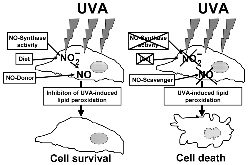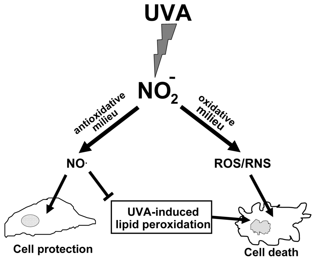 Intracellular nitrite in physiological concentrations has protective effects against UVA. Depletion of nitrite by inhibiting nitric oxide synthase activity and nitrite free supplementation or scavenging NO increases lipid peroxidation and cell death significantly.