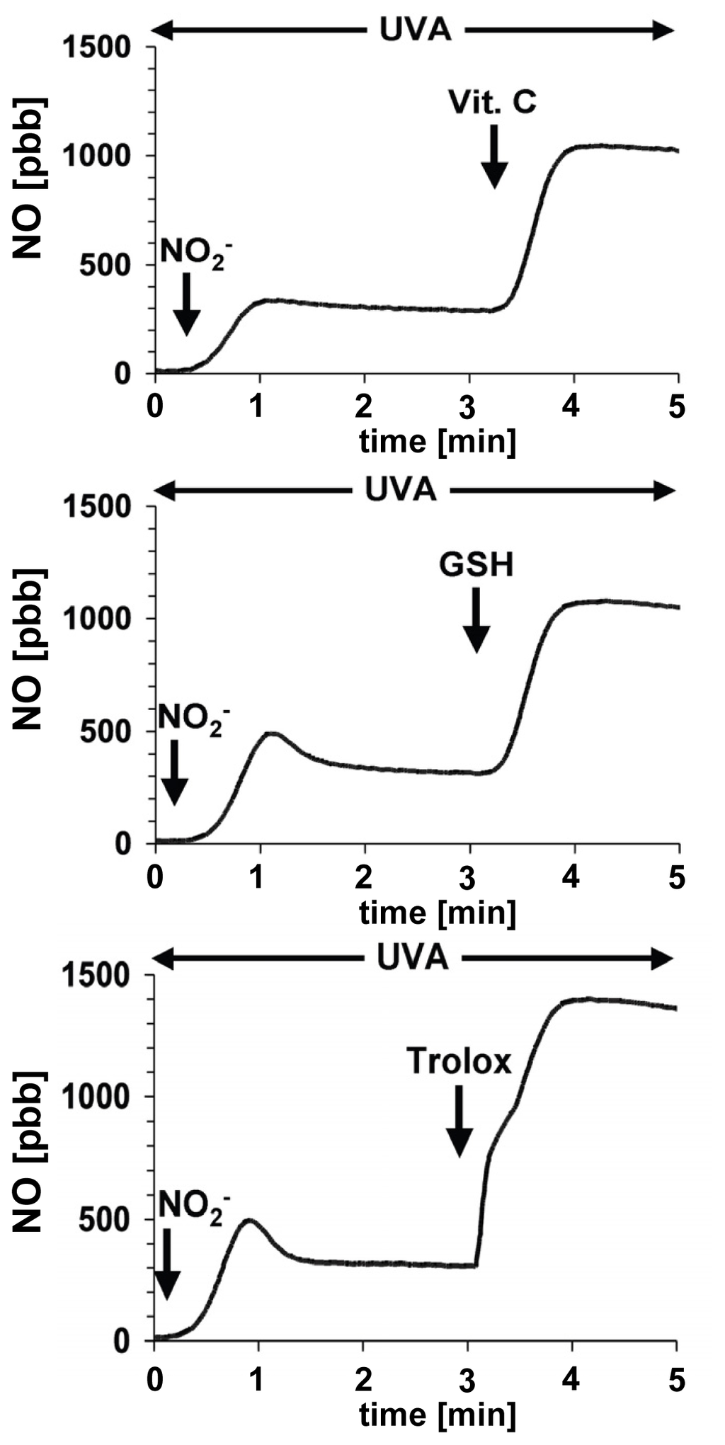 Physiological concentrations (100 μM) of antioxidants, such as vitamin C, glutathione (GSH) or trolox, can enhance significantly the NO-yield obtained from UVA-induced nitrite decomposition (10 μM).