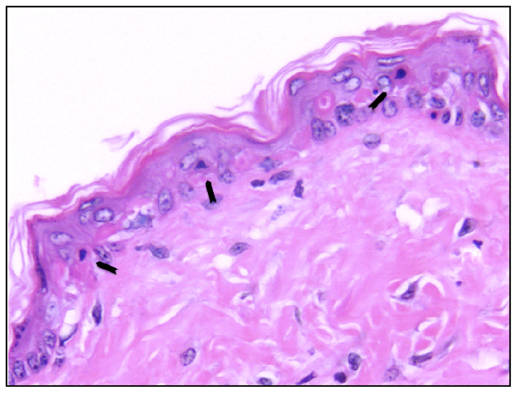 Typical histology of Skh:hr1 mouse skin showing “sunburn cells” or apoptotic keratinocytes, as indicated by black arrows. Sunburn cells are recognised by their pyknotic nucleus and eosinophilic cytoplasm.