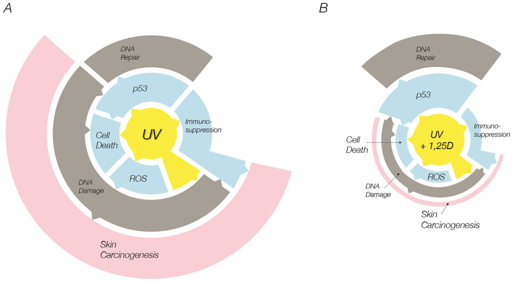 (A) Mechanisms of skin carcinogenesis due to ultraviolet (UV) radiation. UV causes cell death through p53-dependent and -independent mechanisms. p53 may facilitate DNA repair or can induce apoptosis of irreparably damaged cells. UV also causes DNA damage directly via absorption and indirectly via formation of reactive oxygen species. UV and DNA damage can lead to immunosuppression. Together, DNA damage and immunosuppression can initiate skin carcinogenesis; (B) Proposed mechanism for protection against skin carcinogenesis by 1,25D. The sizes of segments indicate reductions and increases caused by 1,25D. Vitamin D compounds can inhibit UV-induced cell death, DNA damage, immunosuppression and skin carcinogenesis. This may involve the ability of vitamin D compounds to further increase p53 after UV, thereby facilitating DNA repair.