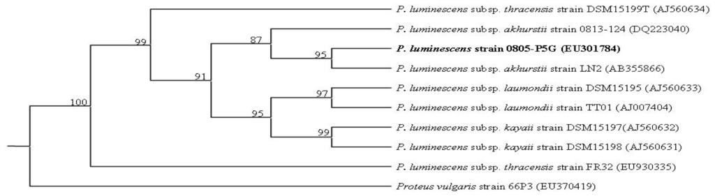 A bacterial strain was selected from others, isolated from infective juveniles (IJs) of Heterorhabditis brevicaudis YS for further work, because it had the highest protease activity based on the clear zone formation around the colonies grown on skim milk agar and on gelatin agar plates. The result of Biolog identification system only supported the identification of the bacterial strain as a Photorhabdus sp. (data not shown). The 16S rDNA sequence of the strain 0805-P5G was deposited in the GeneBank database under accession number EU301784. After analyzing phylogenetic trees, the strain 0805-P5G was most related to P. luminescens subsp. akhurstii strain LN2, it was proposed be within the P. luminescens subsp. akhurstii (Figure 1). We found that the P. luminescens strain 0805-P5G secreted protease from the early logarithmic phase of growth in a variety of media, such as NB, LB and PP3T. The maximum proteolytic activity was obtained from the NB culture medium at eight days post-inoculation with time-course data (data not shown).