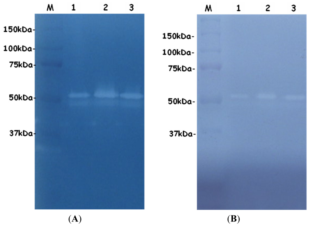 The authenticity of the protease was confirmed by SDS-PAGE and zymograms. The purified protease showed a single band of 51 kDa in SDS-PAGE (Figure 2A) and exhibited proteolytic activity at the corresponding bands in the zymogram with gelatin and casein, respectively (Figure 3).
