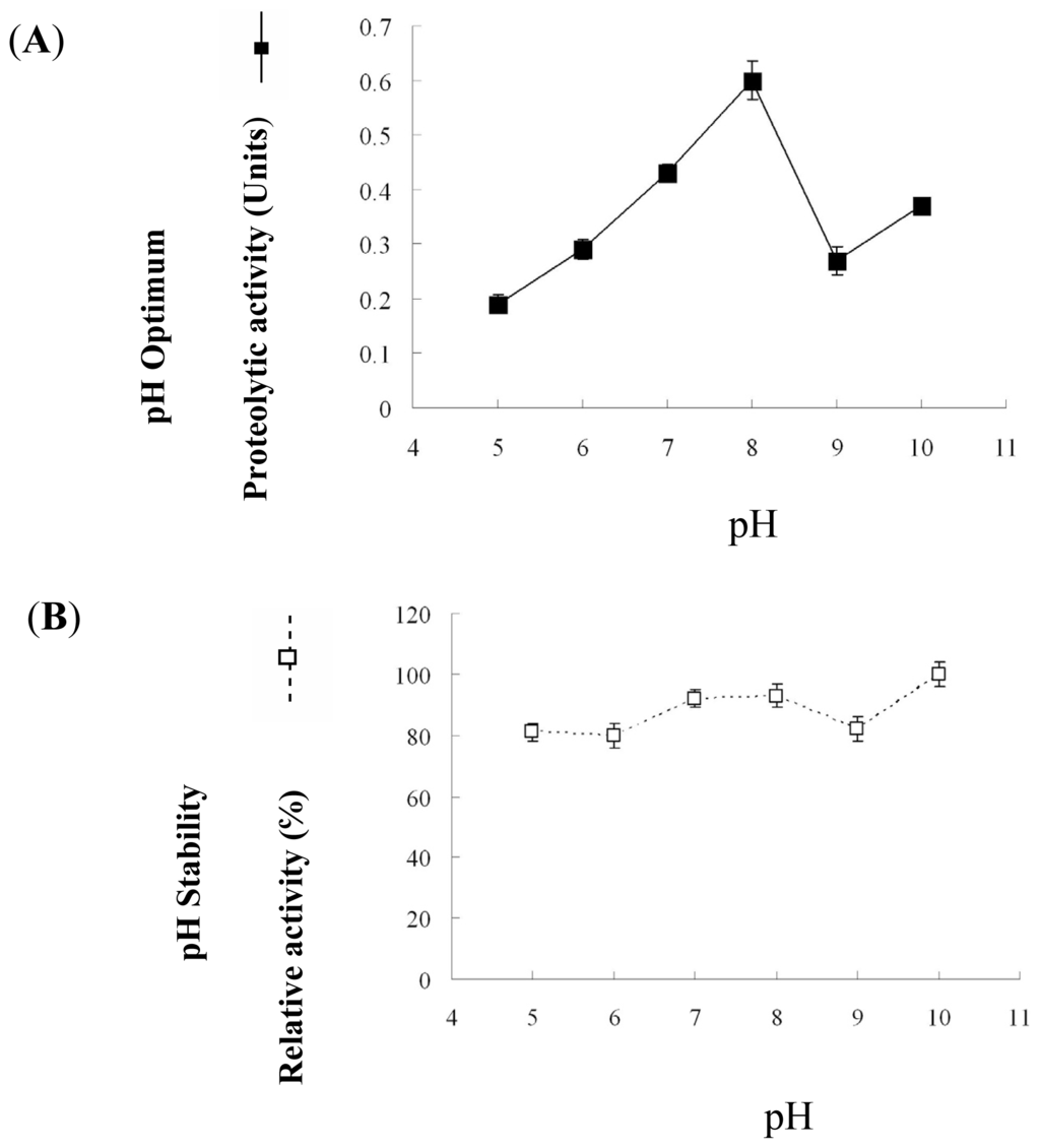 The protease of P. luminescens strain 0805-P5G exhibited highest activity at pH 8 (Figure 4). It remained stable in a wide pH range (5–10) and retained more than 80% of its original activity after incubation for 30 min.